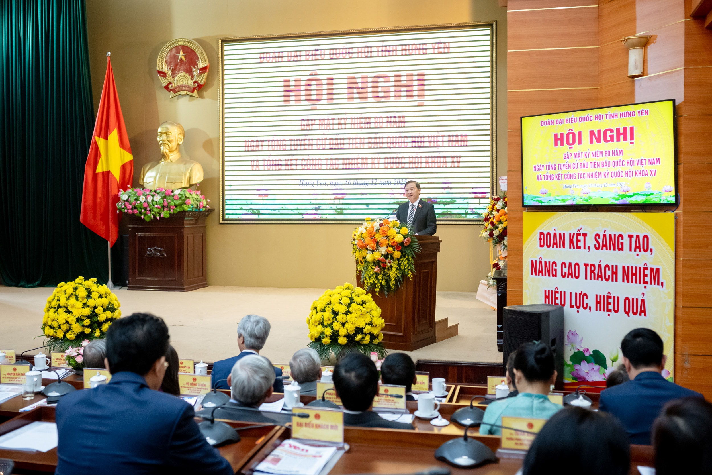 Phó Chủ tịch Quốc hội nêu rõ, 80 năm trước, trong những ngày lịch sử cách mạng, dưới ngọn cờ của Đảng, toàn dân tộc vùng lên làm chủ vận mệnh của mình, cùng cả nước, cử tri và Nhân dân trong tỉnh với khát vọng độc lập, tự do, hăng hái tham gia Ngày Tổng tuyển cử, bầu những đại biểu xứng đáng tham gia Quốc hội khoá I. Nhận thức được vinh dự, trách nhiệm trước Quốc hội, trước Đảng bộ, Nhân dân và cử tri trong tỉnh và cả nước, Đoàn ĐBQH tỉnh Hưng Yên - Thái Bình và có một thời gian là tỉnh Hải Hưng các khoá đã nỗ lực rèn luyện, phấn đấu đóng góp xây dựng Quốc hội ngày càng lớn mạnh, hoàn thành nhiệm vụ và yêu cầu thực tiễn của đất nước; cùng Đảng bộ, chính quyền và Nhân dân tỉnh nhà lập nên nhiều thành tích quan trọng, vẻ vang trong sự nghiệp cách mạng 80 năm qua.